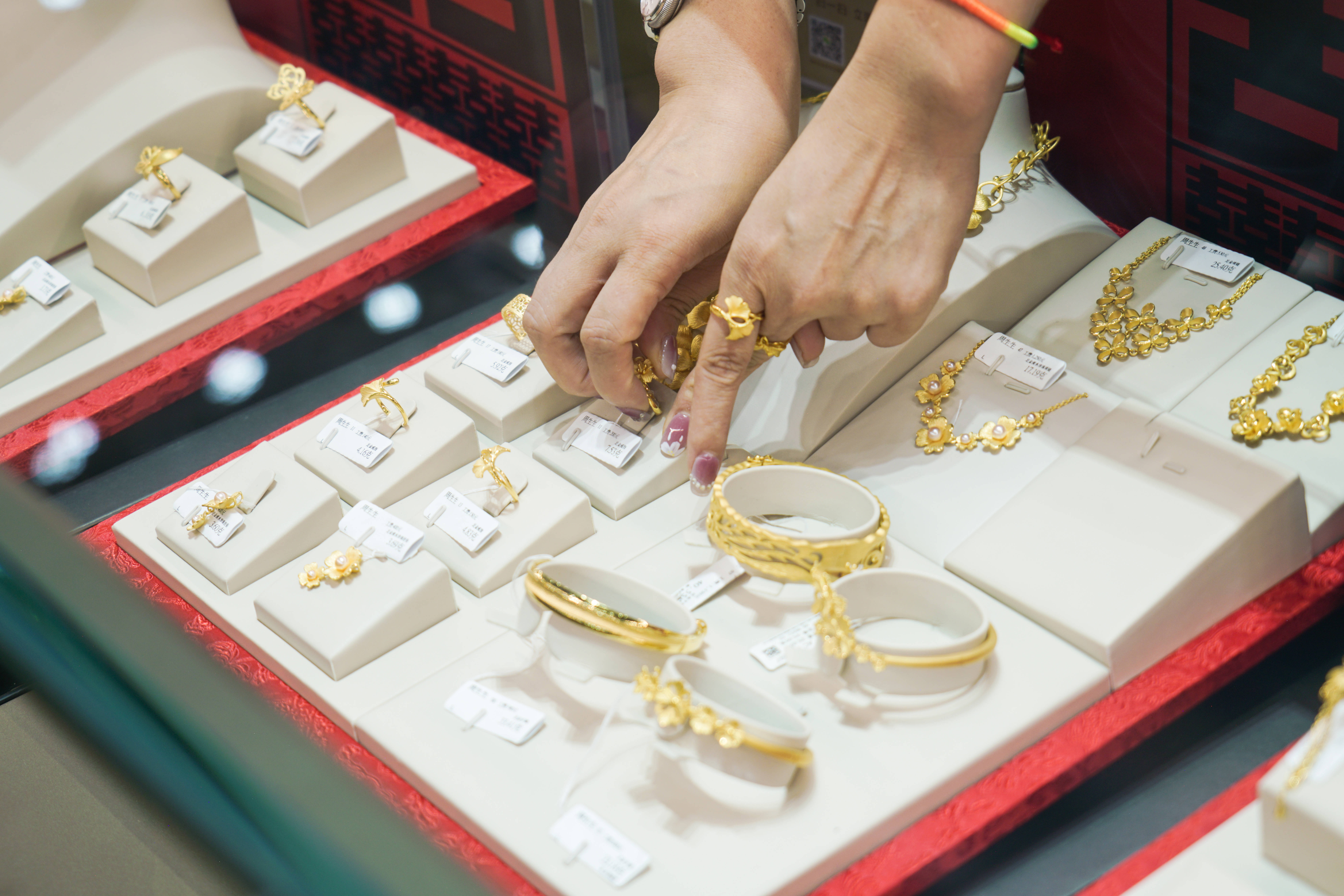 黄金税改新政出台第三日,中邦内地和香港两地众家黄金珠宝零售商正在周一开盘后股价纷纷下跌。截至界面讯息发稿时,A股的潮宏基跌幅亲昵 10%,港股的周大福珠宝、老铺黄金股价跌幅超出8%,六福集团、周生生股价跌幅超出6%。