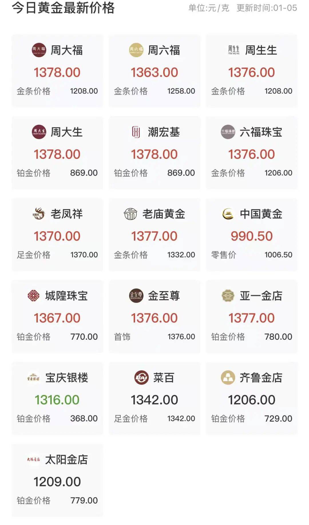 邦内金饰代价应声飙升,周生生足金饰品一夜之间暴涨22元/克,挂牌价直接冲到1376元/克!老庙、老凤祥等品牌紧随其后,涨幅一起横跨20元。老庙报1377元/克,周大福、周大生、潮宏基等报1378元/克。